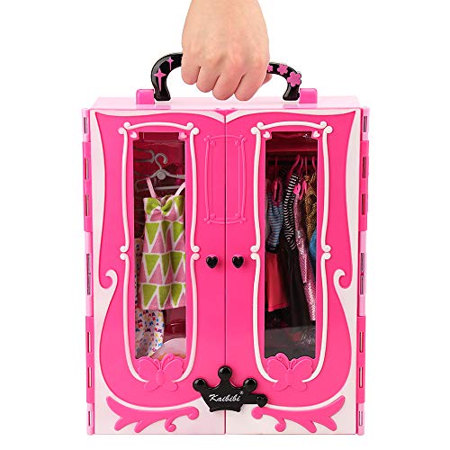 Nos encanta el glamuroso diseño rosa fucsia y los mangos en forma de corazón de este armario de ropa para muñecas portátiles estilo Barbie.