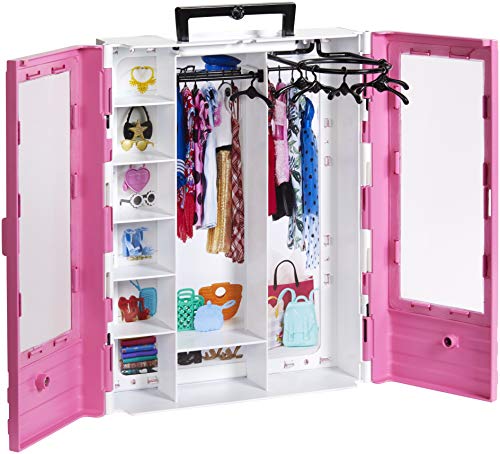 Este armario de los sueños de Barbie se puede llevar a cualquier parte con su asa de transporte. Su diseño rosado con puertas transparentes atrae a las niñas y les permite ver su contenido directamente.