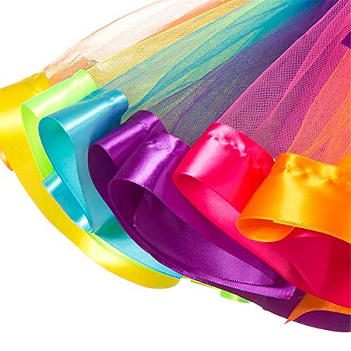 En cuanto a este bonito tutú, con cinturón elástico forrado para mayor comodidad y color arco iris con tonos brillantes casi fluorescentes hecho de baldosas de poliéster: