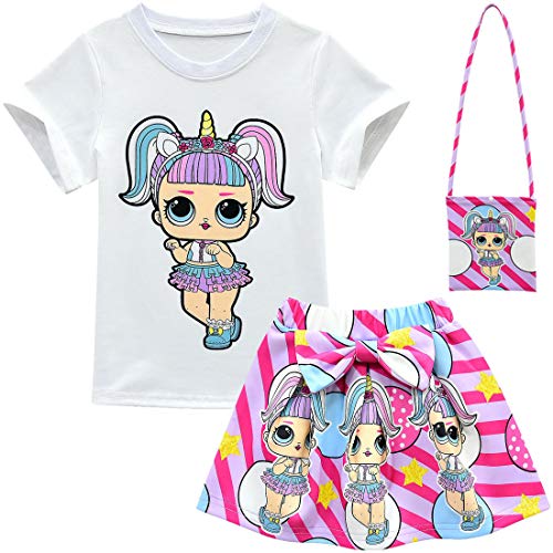 Para todas las niñas que prefieren llevar una falda a un vestido este pequeño conjunto con falda y bolso a juego es muy femenino y pop con sus muñecas LOL sobre un fondo de rayas fucsia.