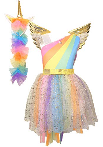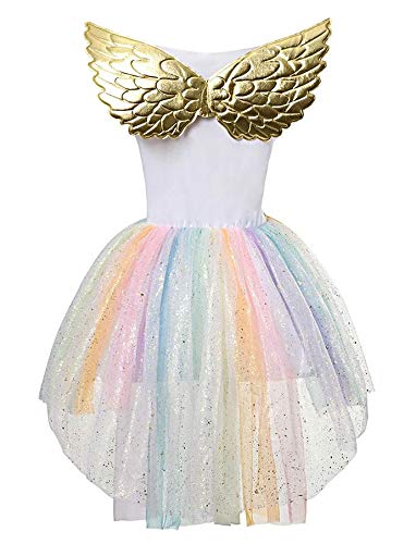 Para las niñas en busca de originalidad, el vestido de unicornio alado dorado multicolor estará a la altura de sus exigencias, con su diadema y su colgante a juego: